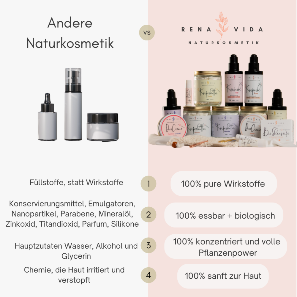 Rena Vida geht weiter als Bio. Wir stellen frische Kosmetik aus essbaren Rohstoffen her – auf Rohkost-Niveau. Das bedeutet: Die Nährstoffe bleiben erhalten. Die Struktur der Pflanzenöle und -buttern bleibt lebendig. Die Haut bekommt das, was sie biologisch versteht. Deine Haut ist dein größtes Organ. Sie verdient echte Nahrung – keine Kosmetik-Illusion.